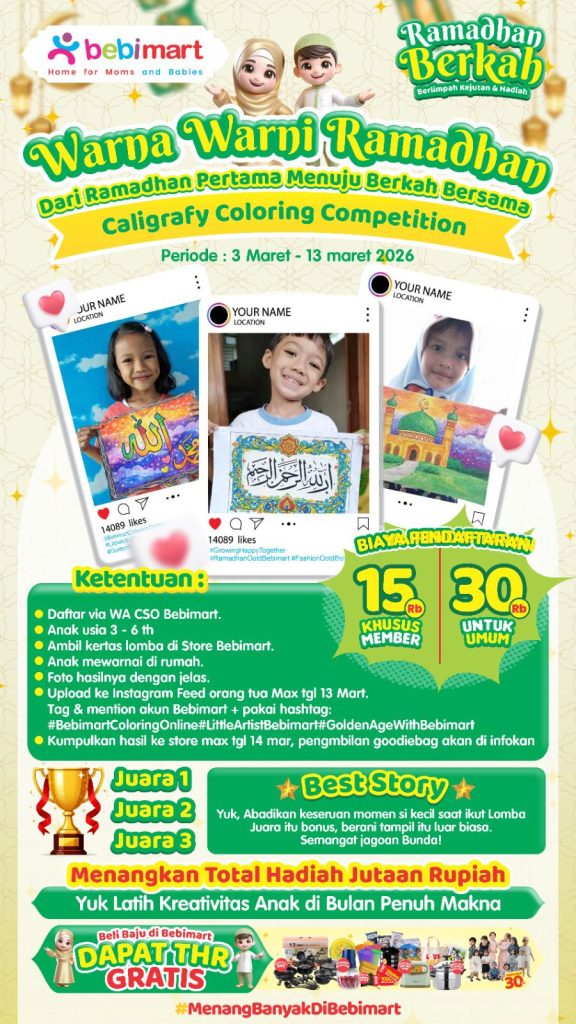 Yuk isi waktu Ramadhan Sikecil dengan kegiatan penuh makna di bulan suci Ramadhan ini Bun. Caligrafy coloring competitions ini adalah lomba mewarnai kaligrafi untuk melatih kreativitas, motorik serta kognitif Sikecil terutama di masa Golden Age Period nya